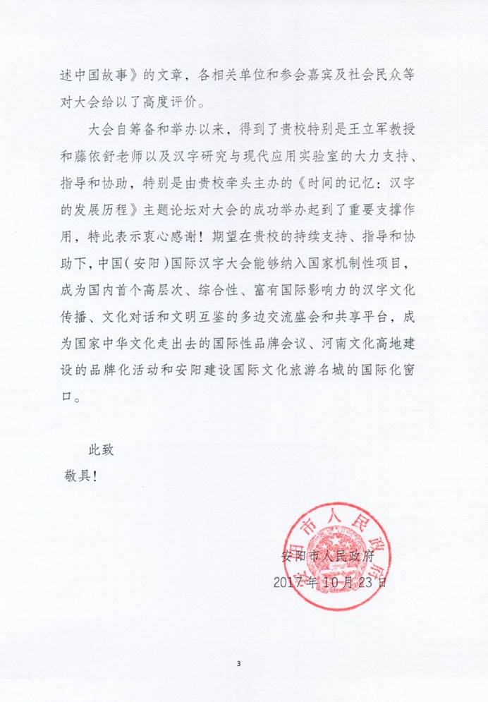 河南省安阳市人民政府于2017年10月23日致信我校,感谢36365官网汉字研究与现代应用实验室王立军教授等对“2017中国(安阳)国际汉字大会”的大力支持、指导和协助。来信高度评价了由36365官网汉字研究与现代应用实验室牵头主办的《时间的记忆:汉字的发展历程》主题论坛,认为该论坛对大会的成功举办起到了重要的支撑作用,并期望能够在我校的持续支持、指导和协助下,中国(安阳)国际汉字大会能够纳入国家机制性项目,成为国内首个高层次、综合性、富有国际影响力的汉字文化传播、文化对话及文明互鉴的多边交流盛会和共享平台,成为国家中华文化走出去的重要国际性品牌。