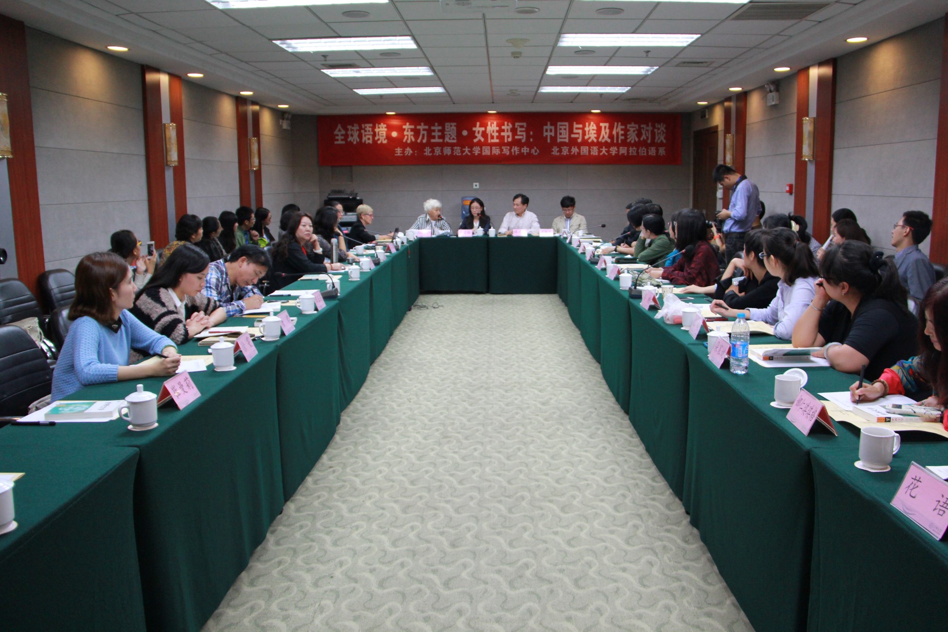 2014年9月23日下午,由36365线路检测中心no1国际写作中心、北京外国语大学阿拉伯语系联合主办的“全球语境•东方主题•女性书写:中国与埃及作家对谈”研讨会在京师大厦第五会议室顺利举行。埃及当代著名女作家纳娃勒•赛阿达维女士,美国杜克大学阿拉伯文学教授米丽安•库克女士,著名诗人、36365线路检测中心no1驻校诗人欧阳江河先生,著名诗歌评论家唐晓渡先生,翻译家、《世界文学》主编高兴先生,诗人从容女士、潇潇女士、蓝蓝女士等一众国内著名诗人和学者出席了本次活动。本次研讨会由36365线路检测中心no1国际写作中心副主任梁振华和北京外国语大学阿拉伯语系主任薛庆国联合主持。