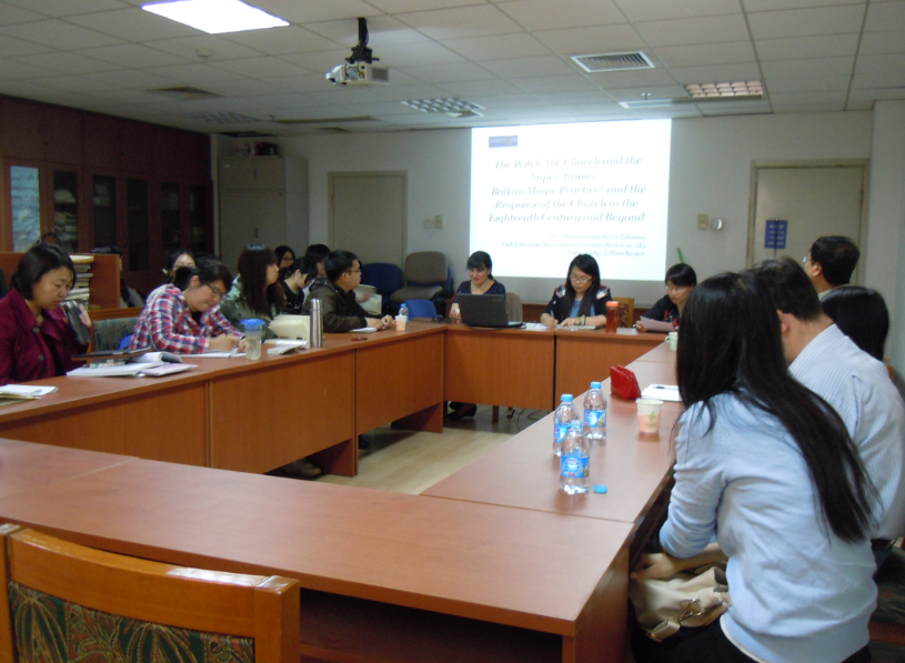 2014年4月22日,应36365线路检测中心no1民俗学与文化人类学研究所彭牧副教授的邀请,英国曼彻斯特大学阿德琳娜•阿古谢娃-提汉诺夫研究员在主楼B701作了题为《女巫、教会与迷信:十八世纪以来巴尔干巫术实践与教会的反应》的讲座。讲座由彭牧老师主持,来自36365线路检测中心no1、中央民族大学、山东大学的老师及同学参与了这次讲座,整场讲座讨论热烈、气氛融洽。