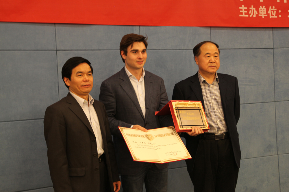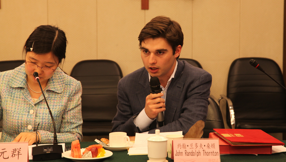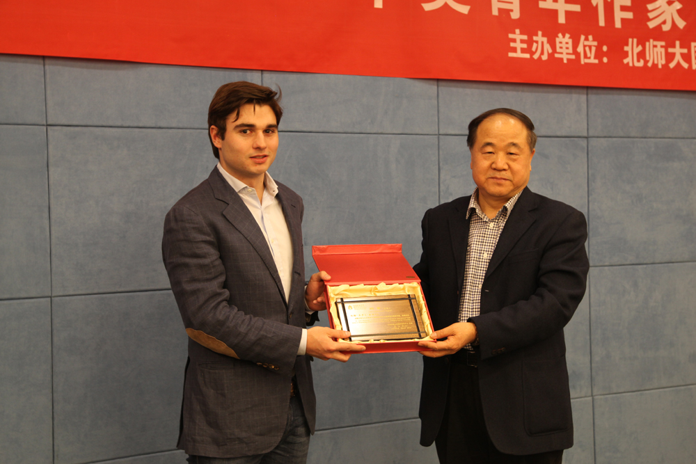 约翰•兰多夫•桑顿用英文做了诚恳的答谢,他作为年轻后辈,十分感谢主办方给他的此次机会,希望与在座的作家学者有更深入的交流。他在美国的学习中发现,世界上优秀的作家都屡次踏足他国,以包容的心态深入理解异域的文化和人民。这种多视角的观察和感受对作家的成长非常重要,它可以及时提炼出文化和人性深处共通的内涵,让作家了解这些内涵多元化的体现形式,创作出来的文学作品自然能使不同国家的读者在作品中感到共鸣。而对桑顿而言,他正在努力学习中国语言和文化,来北京学习就是这样一种宝贵经验,同时,他也希望日后中美作家能够加强沟通交流,共同探讨文学。
