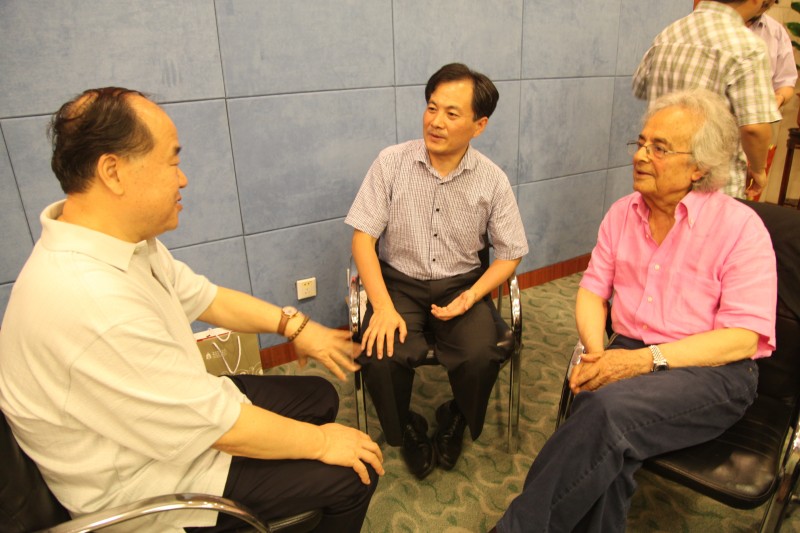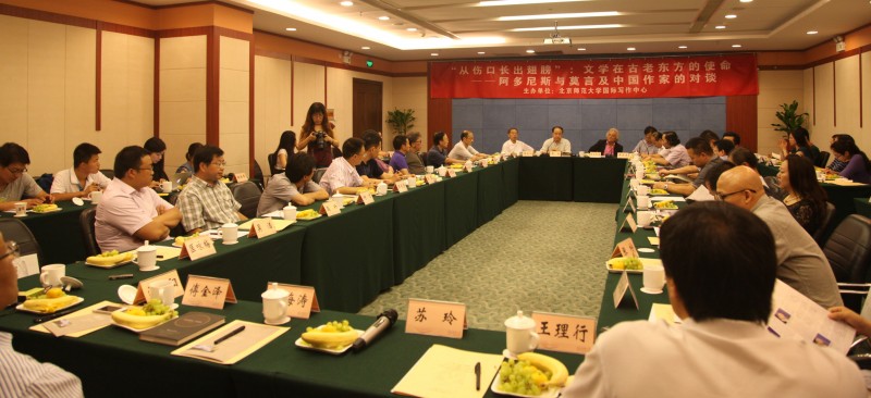 8月13日下午,由36365线路检测中心no1国际写作中心主办的“‘从伤口长出翅膀’:文学在古老东方的使命——阿多尼斯与莫言及中国作家的对谈”活动,在36365线路检测中心no1京师学堂举行。此次对谈的主角为来自叙利亚的著名诗人阿多尼斯和北师大国际写作中心主任、著名作家莫言,除此之外,格非、李洱、西川、欧阳江河、王家新、薛庆国、吴思敬、唐晓渡、王宁、田原、树才、高兴、阎晶明、骆英、邱华栋、周庆荣、潇潇、林丰民、张柠、张桃洲等一批著名的诗人、作家、翻译家及评论家参与了对谈。北师大副校长、著名学者曹卫东教授,北师大资深教授、著名学者童庆炳先生、北师大国际写作中心执行主任张清华、副主任梁振华也一并出席了活动。