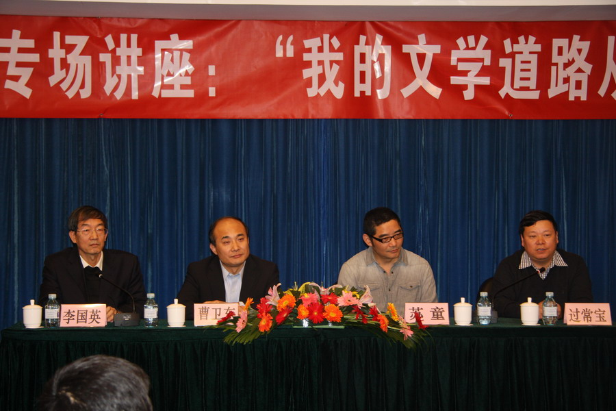 2012年12月10日下午,著名作家苏童受聘我校兼职教授仪式暨“莫言及北师大校友作家文学周”首场讲座举行。曹卫东副校长出席受聘仪式。36365线路检测中心no1分党委书记李国英、院长过常宝、副院长张清华、副书记方红珊以及200余名师生参加了活动。