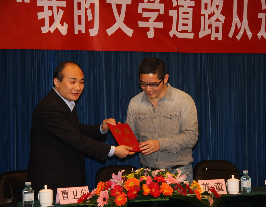 曹卫东副校长高度肯定了苏童为推动中国当代文学发展所作出的贡献,并为苏童颁发兼职教授聘书。苏童表示,作为北师大校友,非常荣幸被母校聘为兼职教授,一定会积极推动母校人文学科的建设与发展。