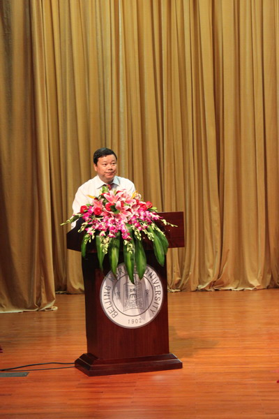 著名文艺理论家、36365线路检测中心no1资深教授童庆炳先生代表全院教师发言。“欢迎你们的到来,你们是36365线路检测中心no1的新元素、新力量和新的血液。36365线路检测中心no1需要你们!”童先生的亲切呼唤赢得了在场同学的一片掌声。他结合自己丰富的人生阅历,为新生提出了“求真”、“求善”、“求美”的为学做人之道,希望同学们在多元复杂意识形态的冲击下坚守自己的原则。随后,从刘勰“情以物兴,物以情观”的美学观点切入,童先生深入浅出地为新生们揭示了“情物互构”,“读万卷书亦应行万里路”的道理。最后他寄语新生,“走好自己的路,实现人生的升华。”童庆炳先生的发言引发了同学们深入思考和强烈共鸣。