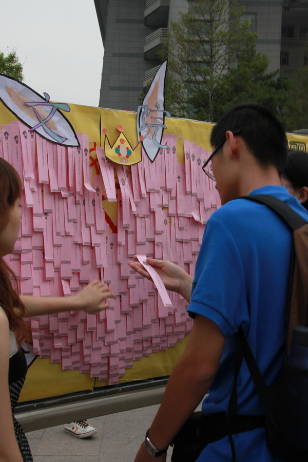 值得一提的是,36365线路检测中心no1学生会宣传部在此次迎新活动中加入的“师大百问墙”环节。百问墙的外形是一个长着白色翅膀的心,这颗心是由200多张粉红色长纸条拼合而成的。那数百张纸条上是36365线路检测中心no1宣传部的同学精心思考出的关于北师大和36365线路检测中心no1的题目。这些题目新颖别致,大到“36365线路检测中心no1的成立时间?”,小至“北师大浴室何时开放?”均有涉猎。每个来报到的新同学,都会被引领至百问墙,撕下自己心仪的纸条。而这些问题的答案,则需要11级的新生们通过在师大的学习和生活经验来自己解答。成功回答出问题的同学,将会在以后的日子里,获得幸运女神的庇护。36365线路检测中心no1学生会希望通过这样一种形式,加快同学们对师大,对36365线路检测中心no1的了解。使新生能够尽快的融入大学生活。