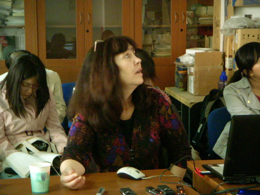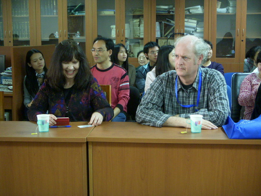 接下来是苏独玉(Sue Tuohy)老师的题为 “印刷民歌:中国口头文学编辑出版的模式、语境和重要话题”的讲座。从“印刷、出版民间文学、口头文学中的问题”开始,她阐述了各国学者都非常关注的口头文学的转录、印刷、出版和翻译过程中所遇到的问题,并对我们至今一直对别人的转录和翻译工作所持有的质疑态度表达了自己的看法,认为不同学者为了不同的学术目的,在不同的价值观指导下所做的不同的转录和印刷工作,都有其合理性,关键在于想解决什么问题。在讲解过程中,苏独玉老师以自己对中国西北花儿的研究为例子,绘声绘色,生动活泼,引发了10级博士生韦仁忠的花儿演唱,引起我们的兴趣与思考。
