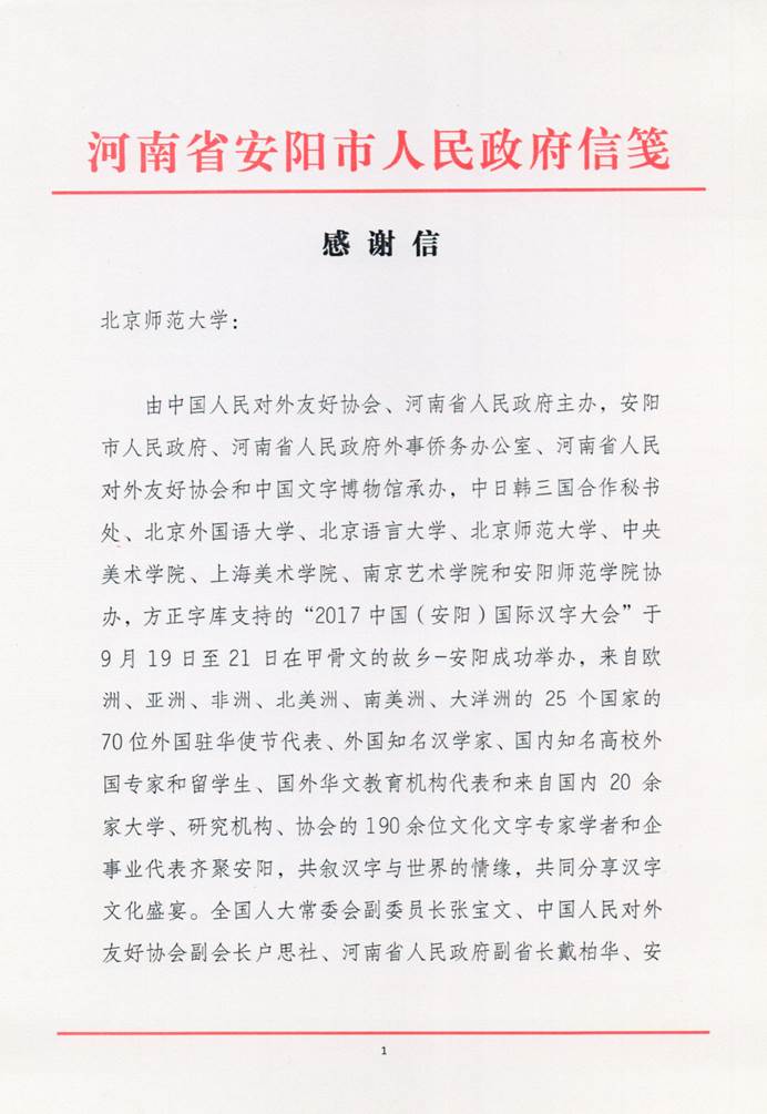 河南省安阳市人民政府于2017年10月23日致信我校,感谢36365官网汉字研究与现代应用实验室王立军教授等对“2017中国(安阳)国际汉字大会”的大力支持、指导和协助。